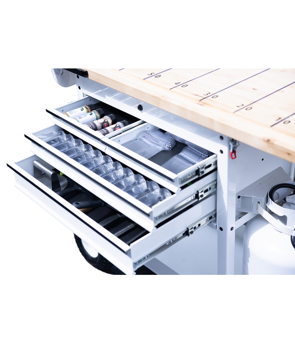 Grab, roll, and grill in seconds. Pack up just as fast: collapse, store, and roll away. With smart compartments for tools, spices, and all things grilling, everything stays organized and within reach. Built for tailgates, patios, or campgrounds, Cali-Kustoms keeps the party flowing and the cleanup effortless.